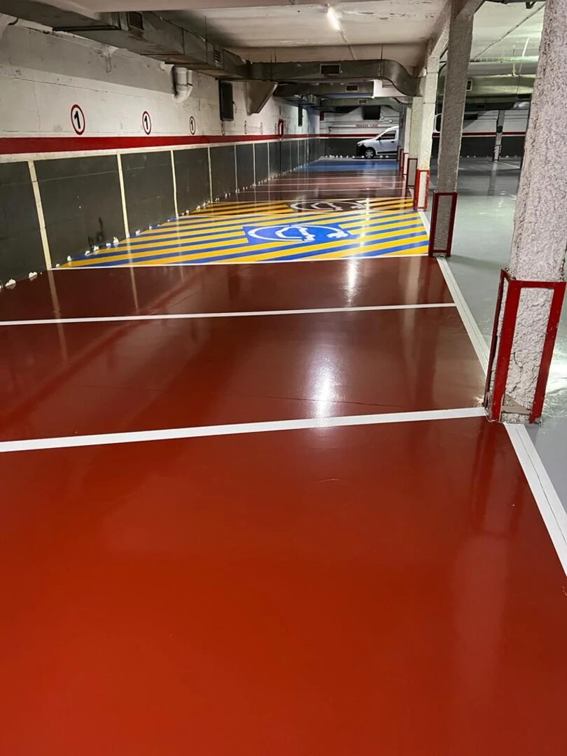 - El sistema de suelos Weber instalado en este parking combina soluciones cementosas y soluciones de resinas para proporcionar un excelente nivel de acabado.