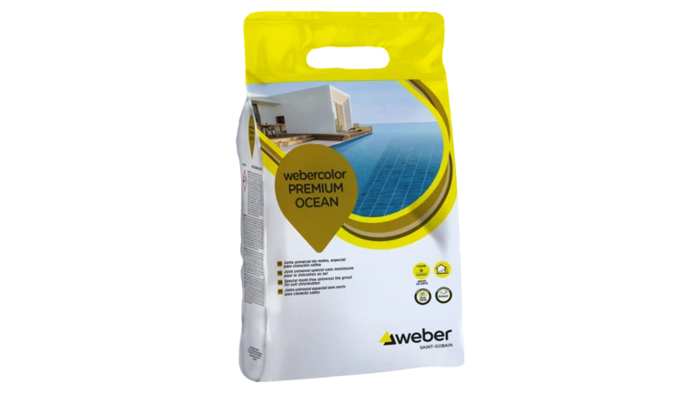 - webercolor PREMIUM OCEAN: Diseñado para piscinas y terrazas con cloración salina, esta fórmula premium previene la corrosión y mantiene el color en 30 tonos exclusivos.