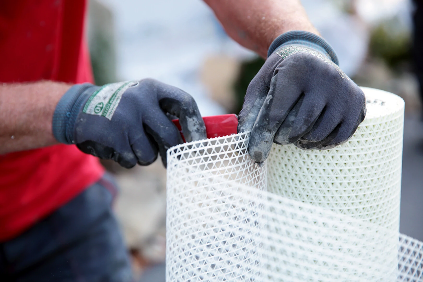 Su manipulación también resulta más fácil si la comparamos con el resto de mallas de refuerzo del mercado. Su estructura más abierta permite una mayor integración con el mortero, lo que repercute en un ahorro de materiales, tanto de malla como del propio mortero. Se trata de un producto cuya estabilidad de cada uno de sus puntos de encuentro es muy superior al estándar, por lo que el corte del mismo también es más sencillo. Al aplicarla sobre el mortero, la malla webertherm 3 FORCE cuenta con un cierto grado de rigidez lo que, sumado a la disposición de sus filamentos en diagonal, hacen más sencilla la tarea de lograr una superficie plana, ya que estos filamentos siguen los movimientos de la llana durante el proceso de alisado.