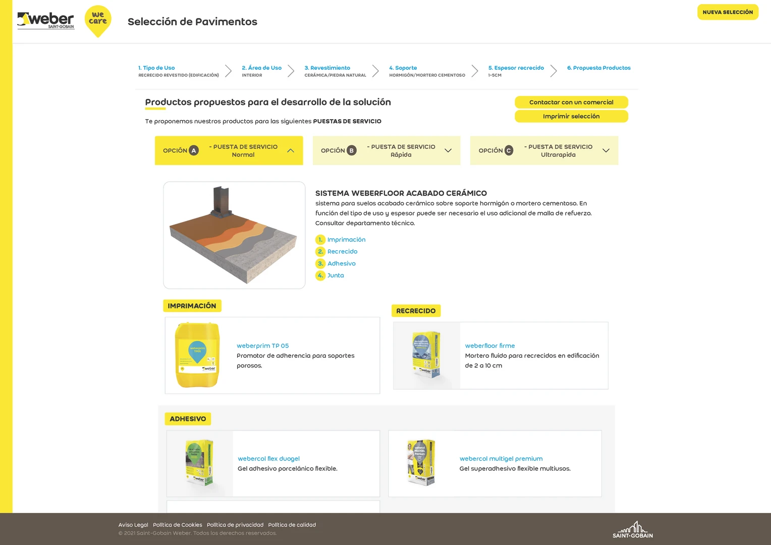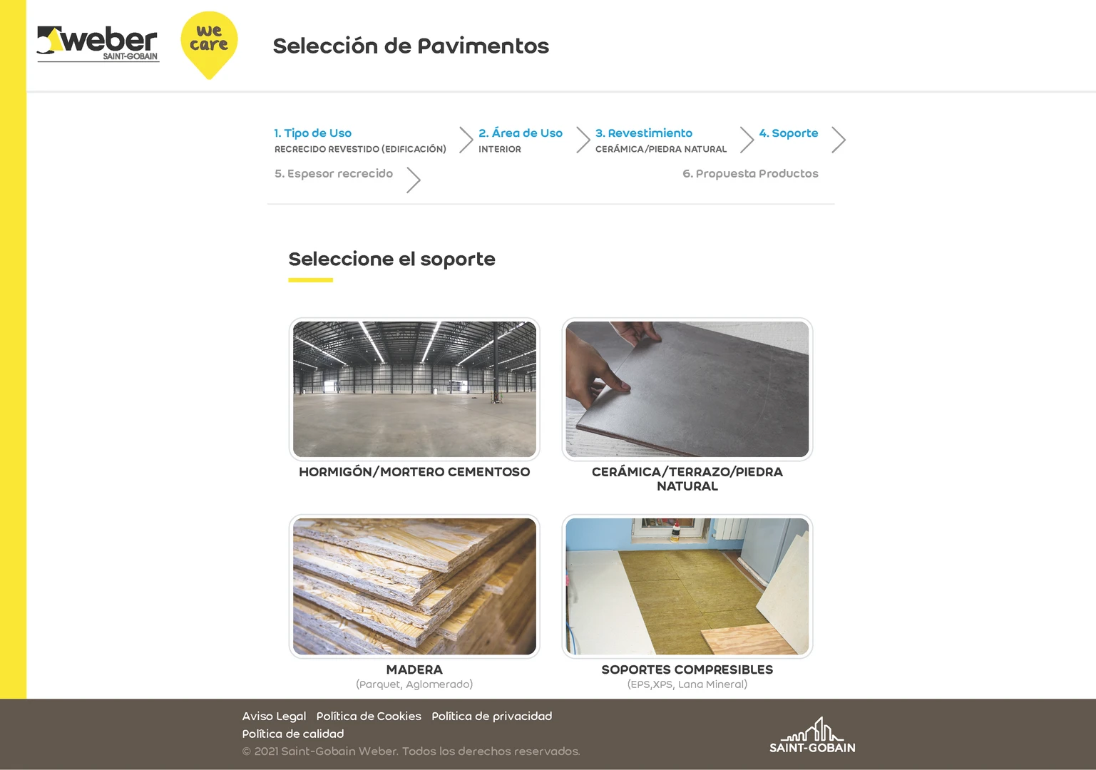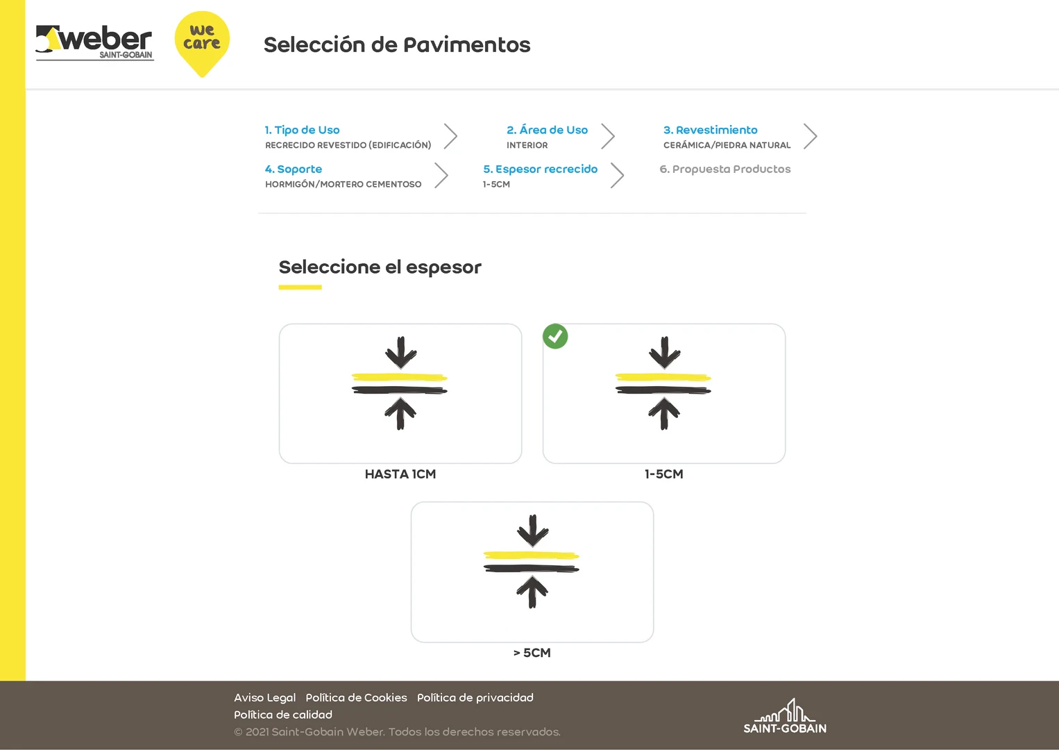 A través de un sencillo proceso en el que escoger tus necesidades constructivas sobre el pavimento que quieres colocar obtendrás las propuestas de productos especialmente diseñadas para tus selecciones.