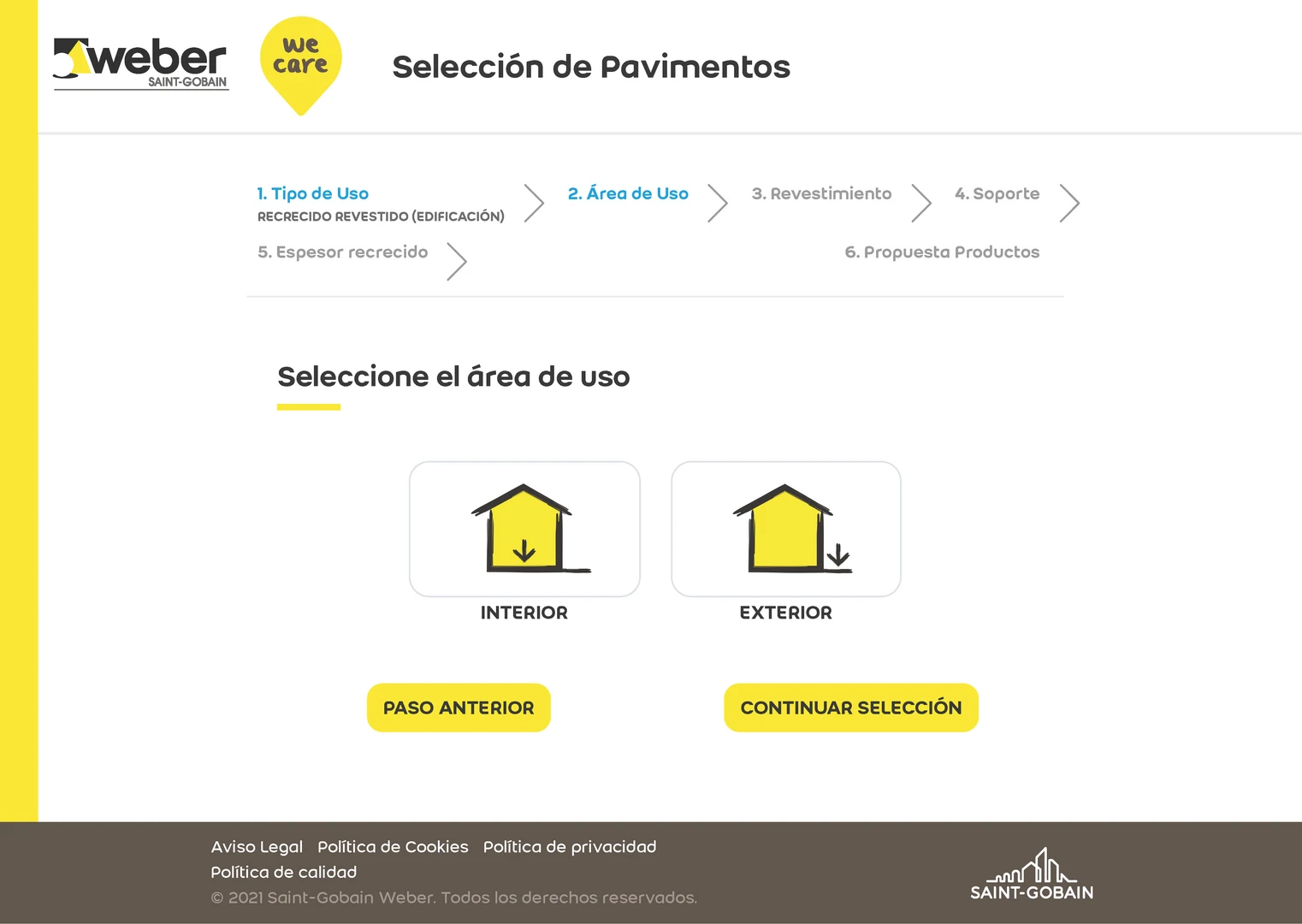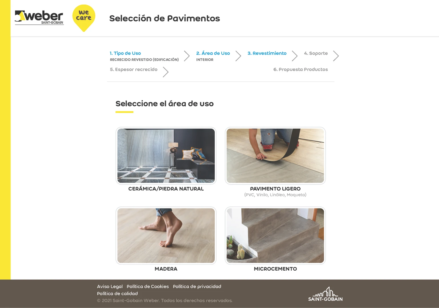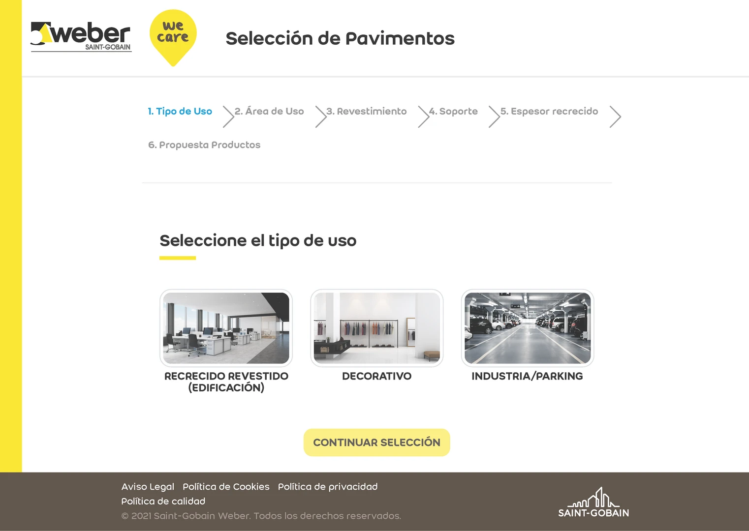 A través de un sencillo proceso en el que escoger tus necesidades constructivas sobre el pavimento que quieres colocar obtendrás las propuestas de productos especialmente diseñadas para tus selecciones.