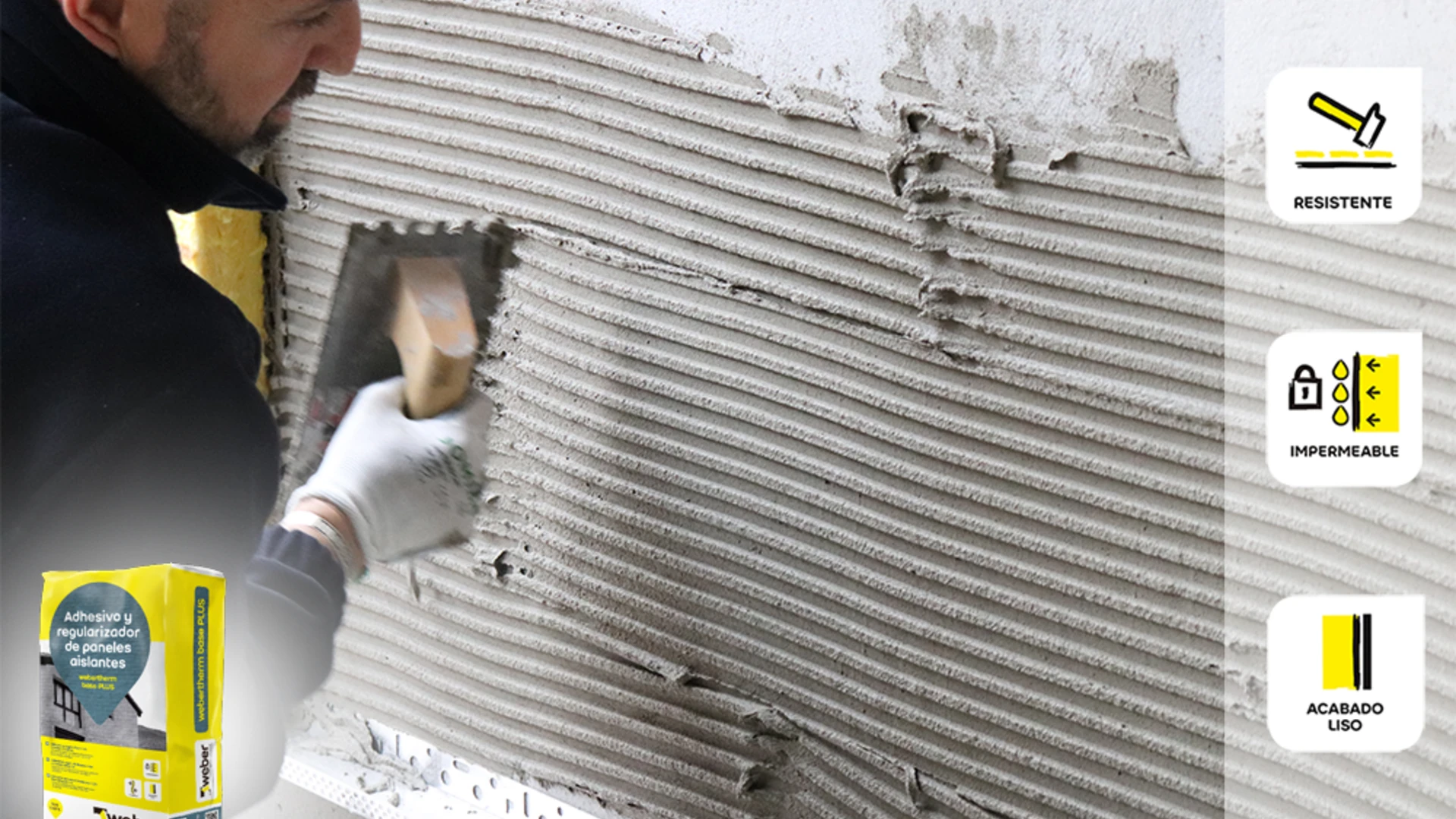 webertherm base plus, un mortero especialmente concebido para la adhesión y regularización de paneles aislantes en los sistemas webertherm. Entre los principales beneficios de este producto, destaca su impermeabilidad (manteniéndose siempre seco), acabado liso y perfecto gracias a la ligereza de su composición, y una alta resistencia frente a los impactos.