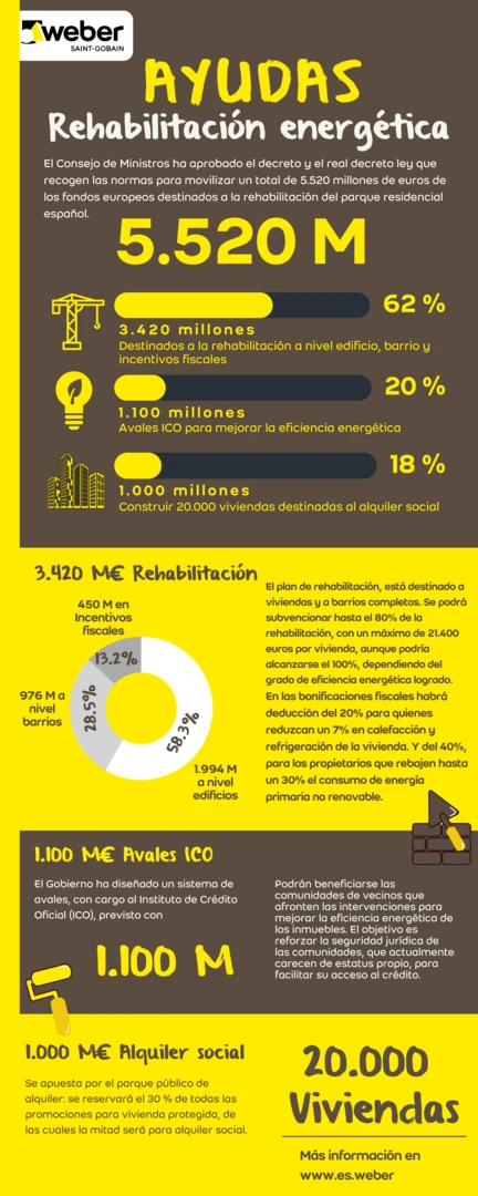 Se destinan un total de 3.420 millones, a los que se suman 1.000 millones para construir unas 20.000 viviendas destinadas al alquiler social y 1.100 millones en avales ICO para incentivar las intervenciones.er social y 1.100 millones en avales ICO para incentivar las intervenciones.