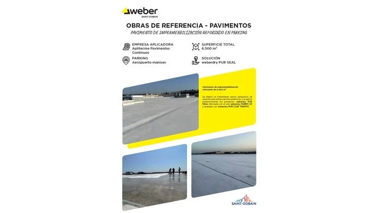 Aplicación del sistema de impermeabilización reforzado para parking de vehículos en cubierta en una superfície de 6500m2. Se realizó un tratamiento previo exhaustivo de soporte para retirar parches anteriores y se aplicó posteriormente los productos weber.