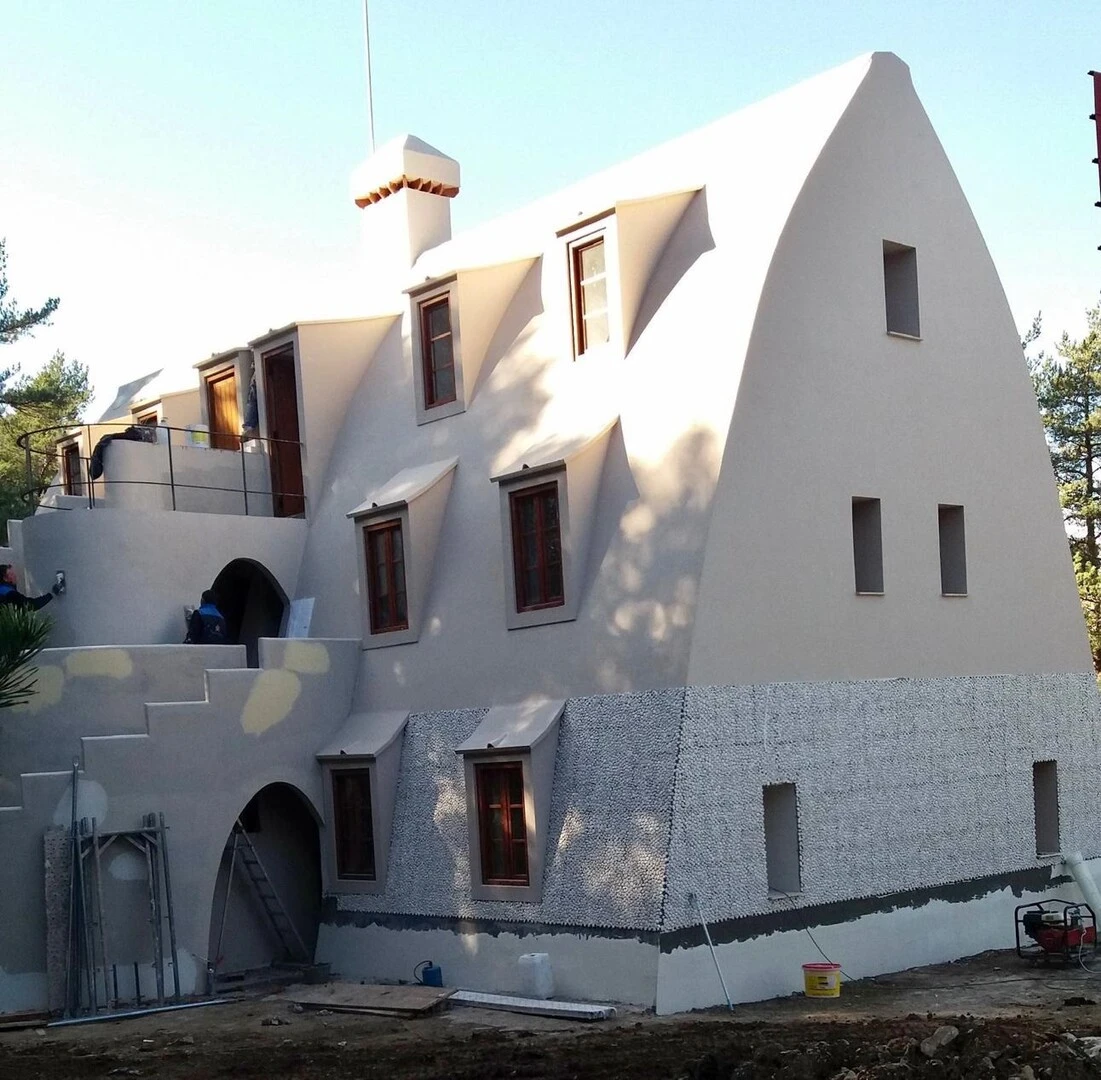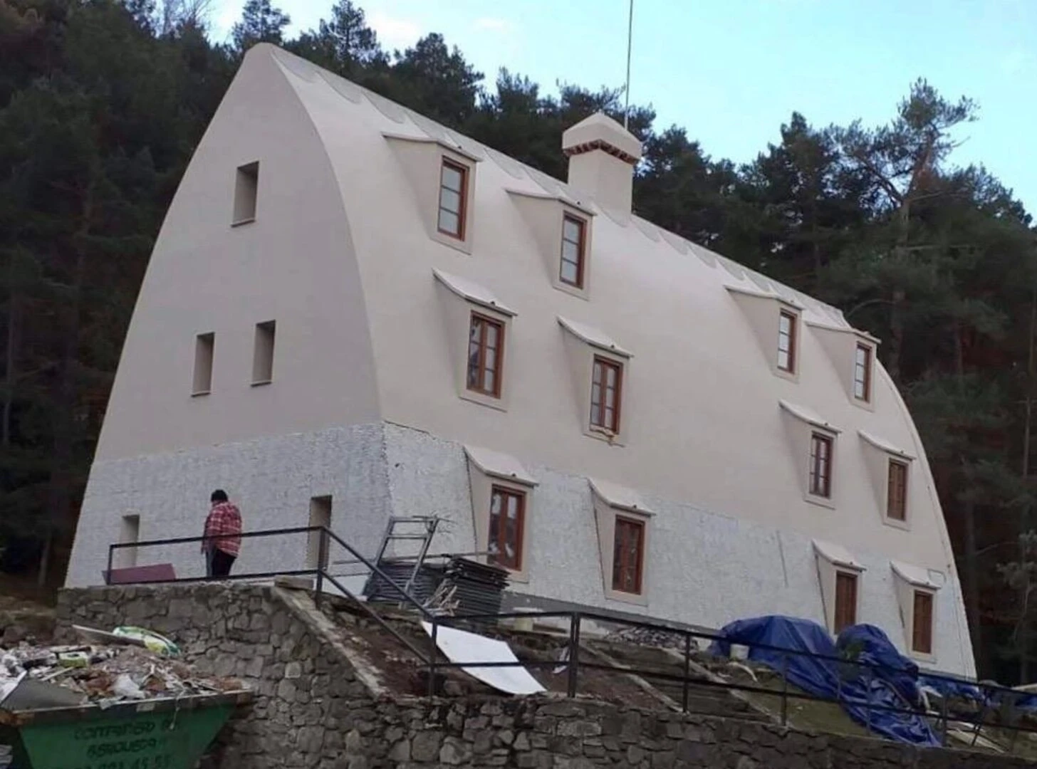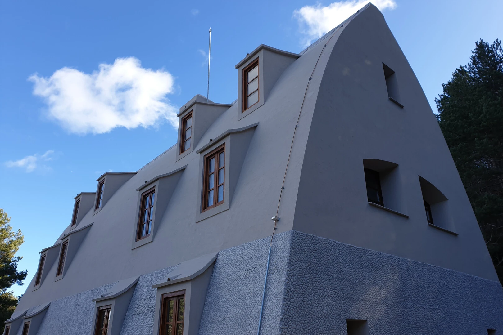 Se ha elegido el Sistema SATE webertherm etics como acabado para darle un aspecto uniforme a los 800 m2 de fachada/cubierta y para aislar térmicamente el edificio. Además se impermeabilizó con el sistema weberdry imperflex para dar un tratamiento resistente a las lluvias de esta fachada que hace las veces de cubierta. A pesar de que la superficie es un arco, se ha adaptado las placas de EPS raspándolas para que el acabado fuera uniforme y sin dejar ver el formato de 100x50cm del EPS.